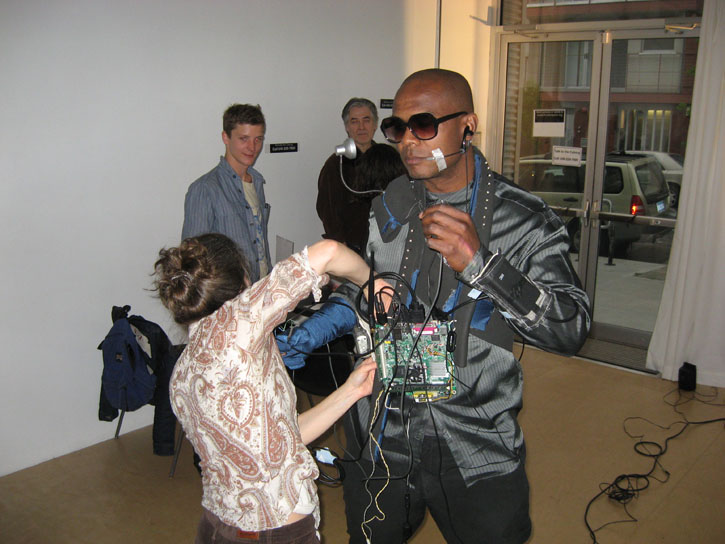 This version of Cyborg Nation was addressing our relationship to ineffable electromagnetic field, and addressed our reliance on its waveforms. It included a window installation that remained up for a month, as well as a series of performance interactions, with three different performers inhabiting the SCoPE. During the interactions a projection made from manipulating graphic representations of the electromagnetic field played constantly.